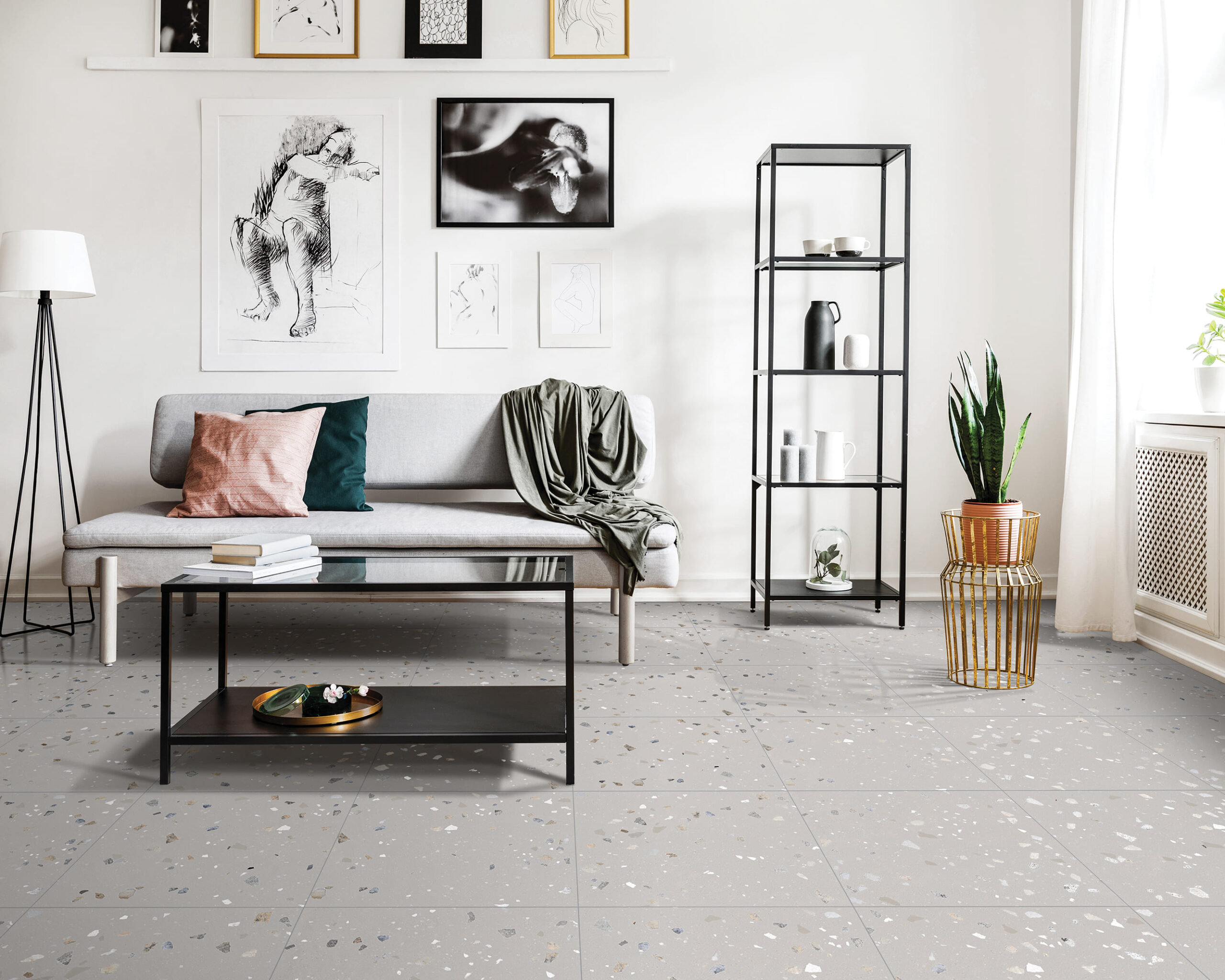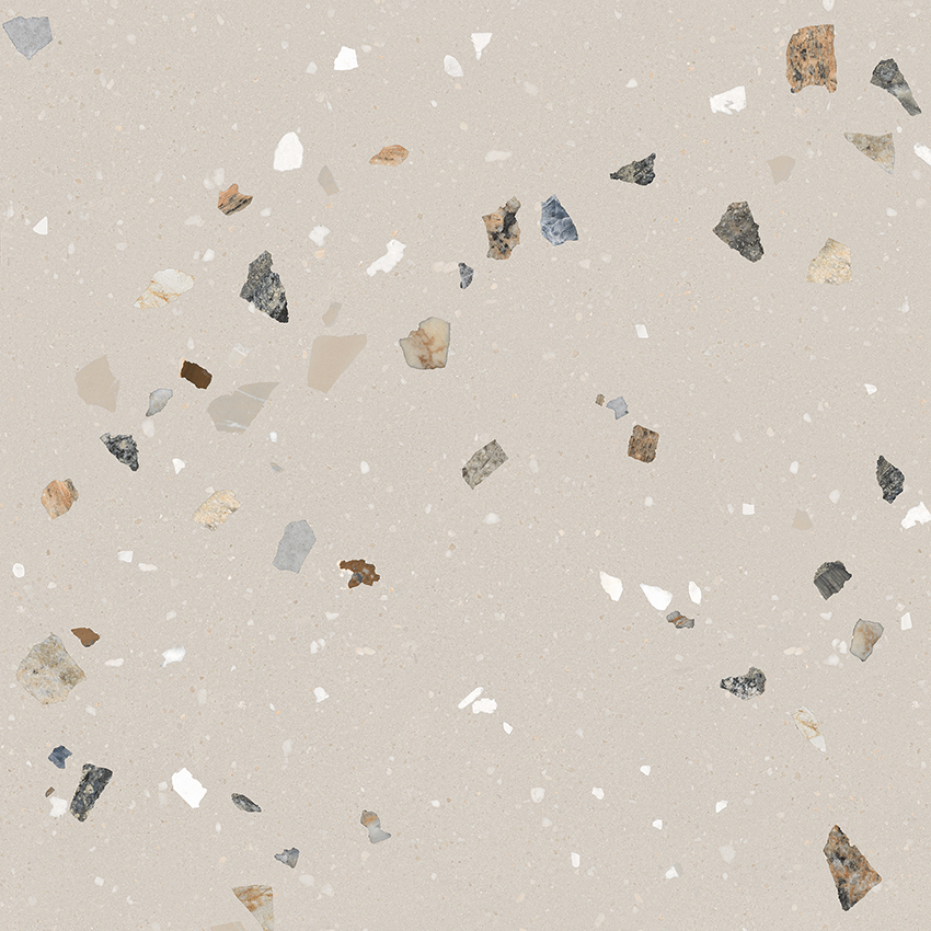 這款磁磚點綴黑、灰、白、咖等天然礫石碎料,展現出細膩卻不喧嘩的視覺層次。