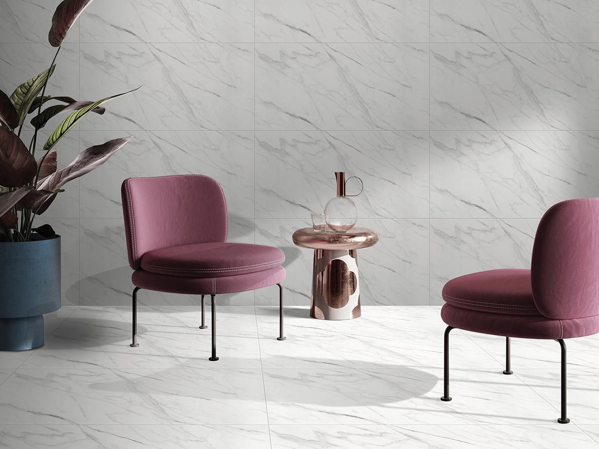 以純白基底搭配自然灰色流紋,紋理自然流動、層次分明,整體風格高雅、明亮,營造出雲霧般的輕盈感,空間瞬間提亮。