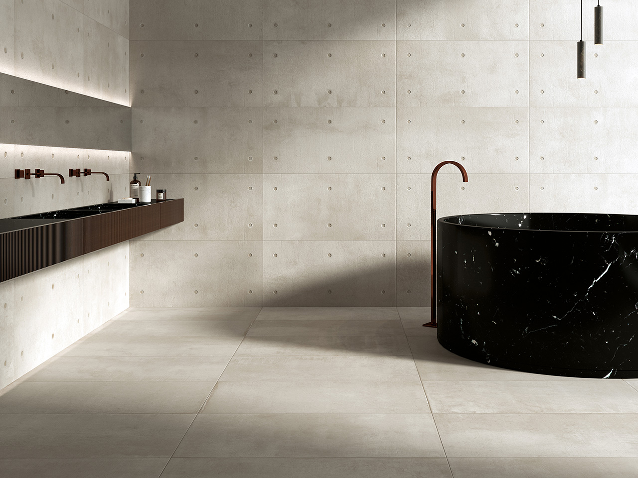 呈現原始工藝質感與現代簡約設計的融合。淺灰色調搭配自然的點狀凹孔細節,使牆面或地面呈現出充滿建築感的美學層次。