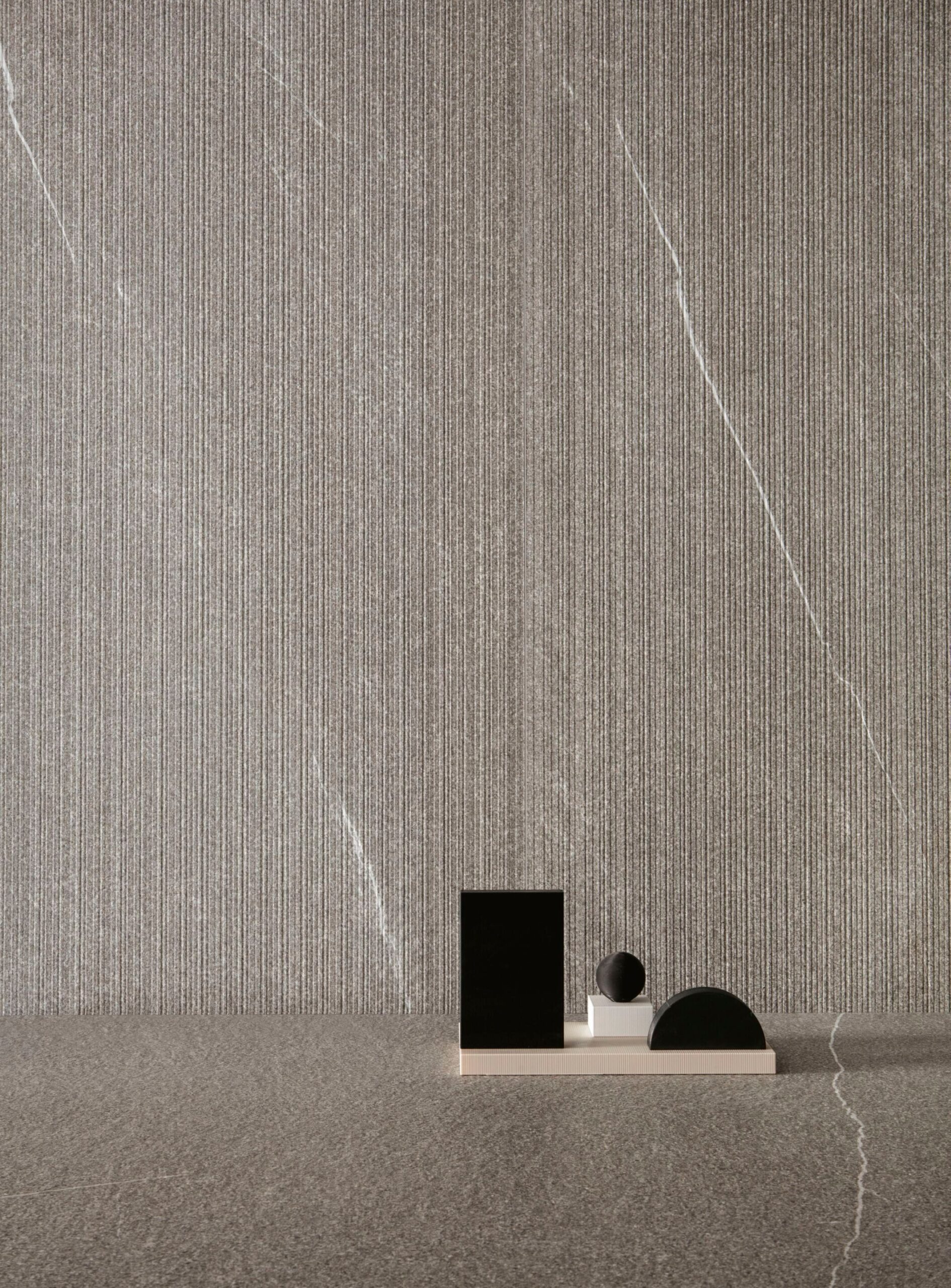 柔和的灰調搭配細緻的羅紋紋理與自然白色礦脈,呈現低調奢華的空間氛圍。